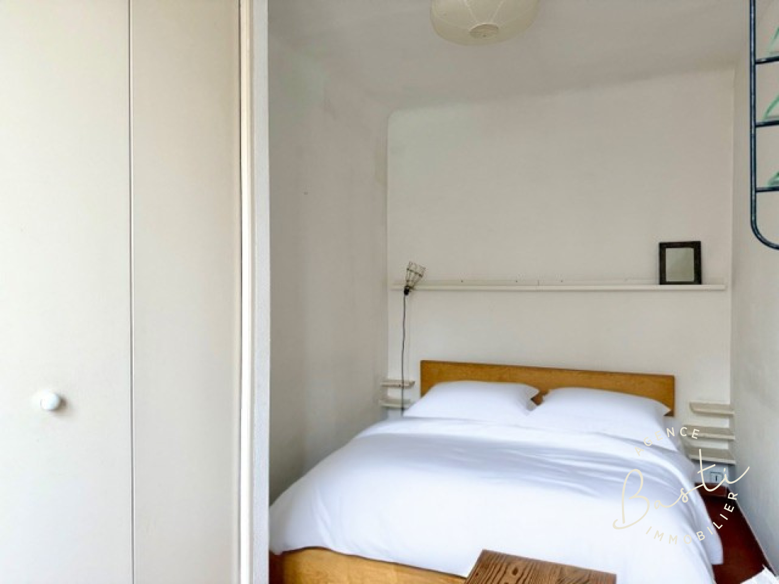 La cuisine est séparée et fonctionnelle. La chambre avec ses rangements intégrés est située au calme sur l'arrière.